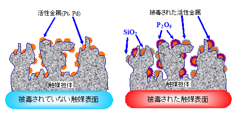 触媒性能劣化の最も多い原因は、触媒毒と呼ばれる物質による触媒被毒です。