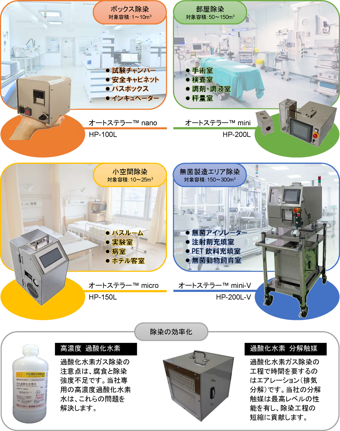 過酸化水素ガス発生装置 『オートステラー™シリーズ』 は、除染対象の施設や用途に合わせて様々なモデルをご用意しております。